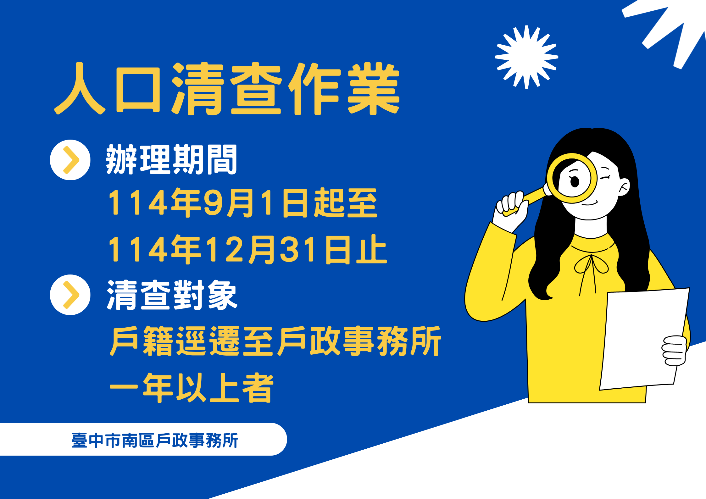 人口清查 1.本所於114年9月1日至114年12月31日辦理清查「戶籍逕遷至戶政事務所一年以上者」之戶籍狀況,請民眾配合戶政人員辦理人口清查作業。 2.若您接獲以語音或電話要求您提供個人資料,請先向戶政事務所查證或撥打165反詐騙專線,避免受騙。