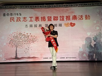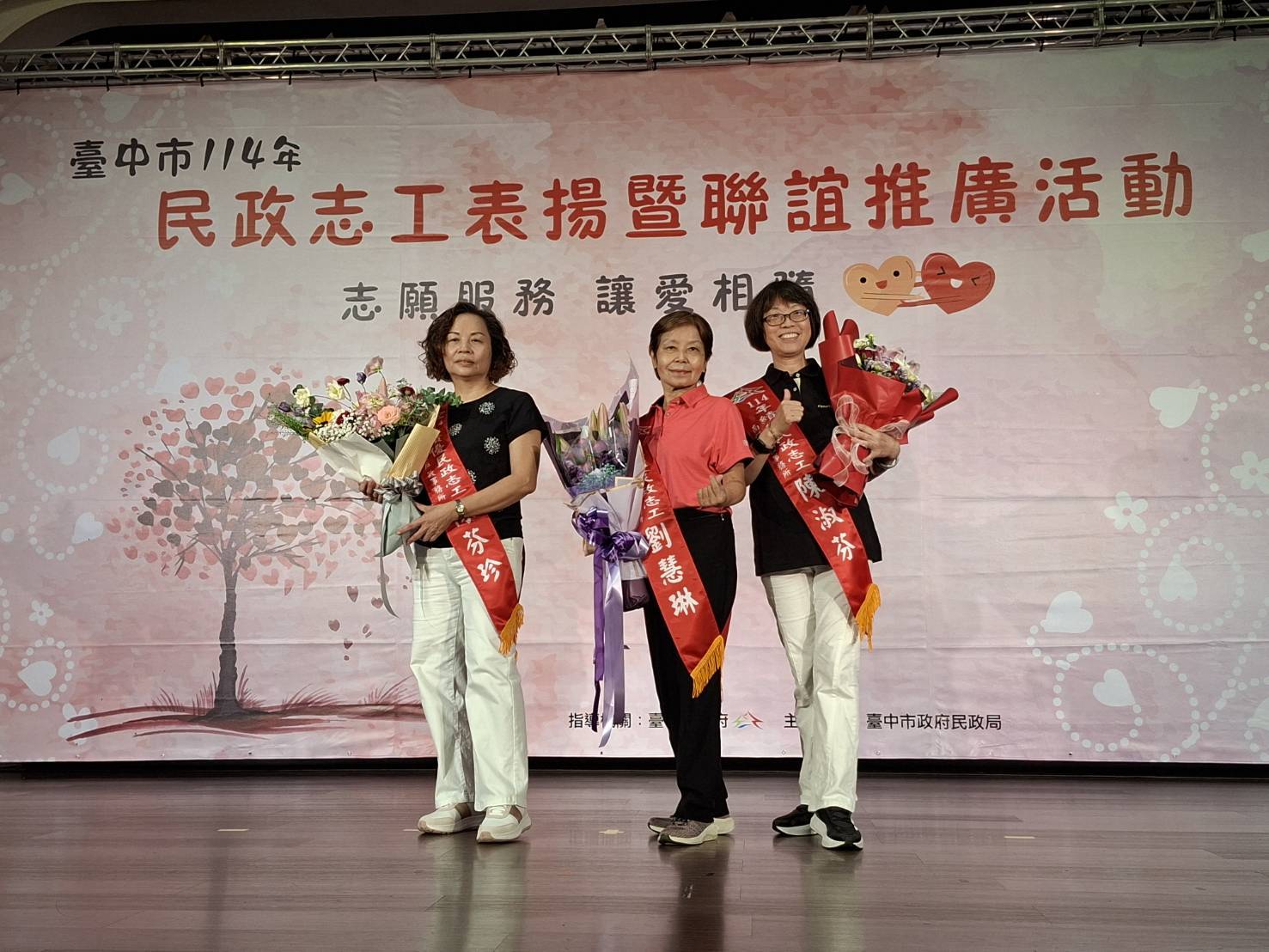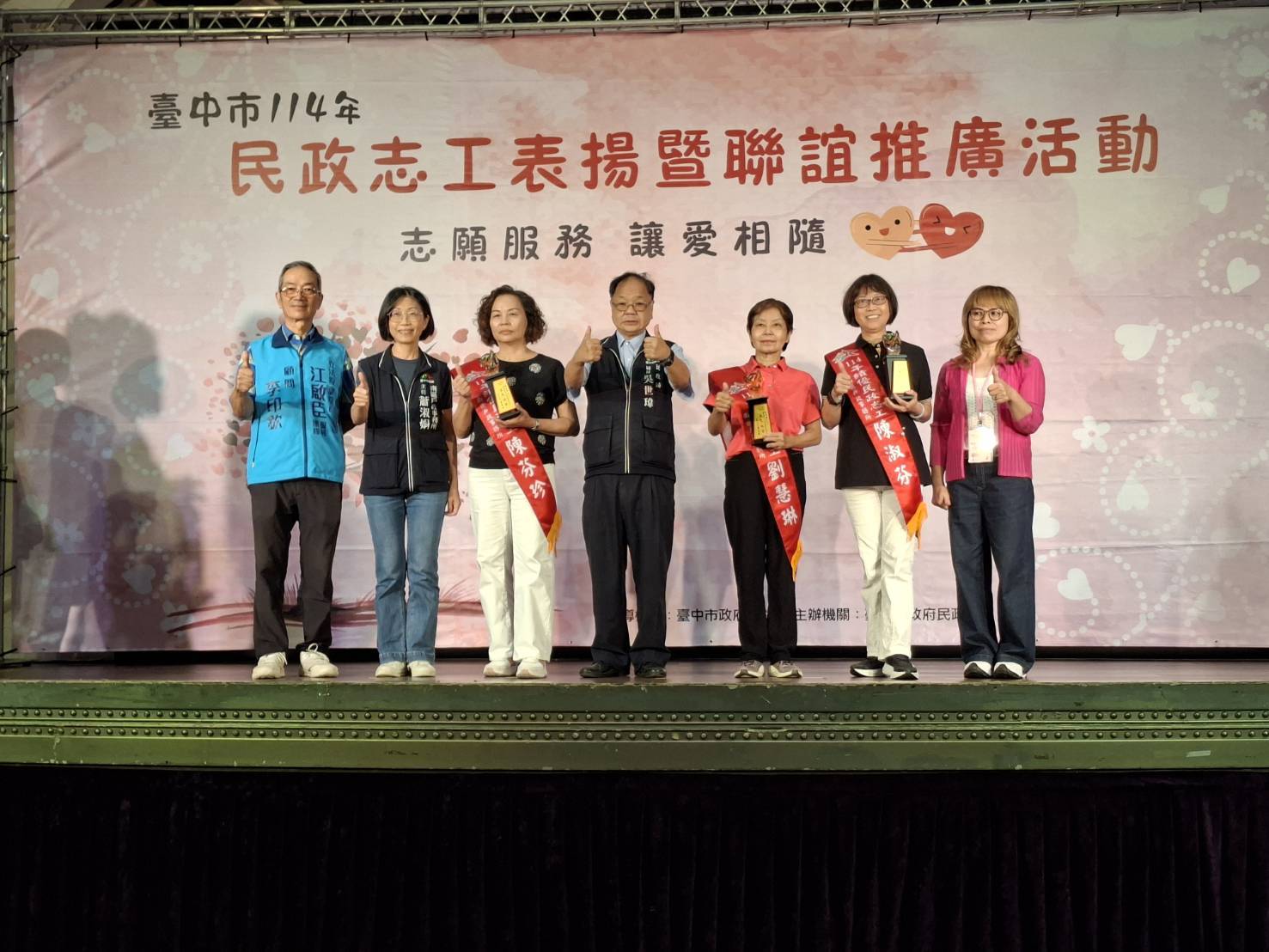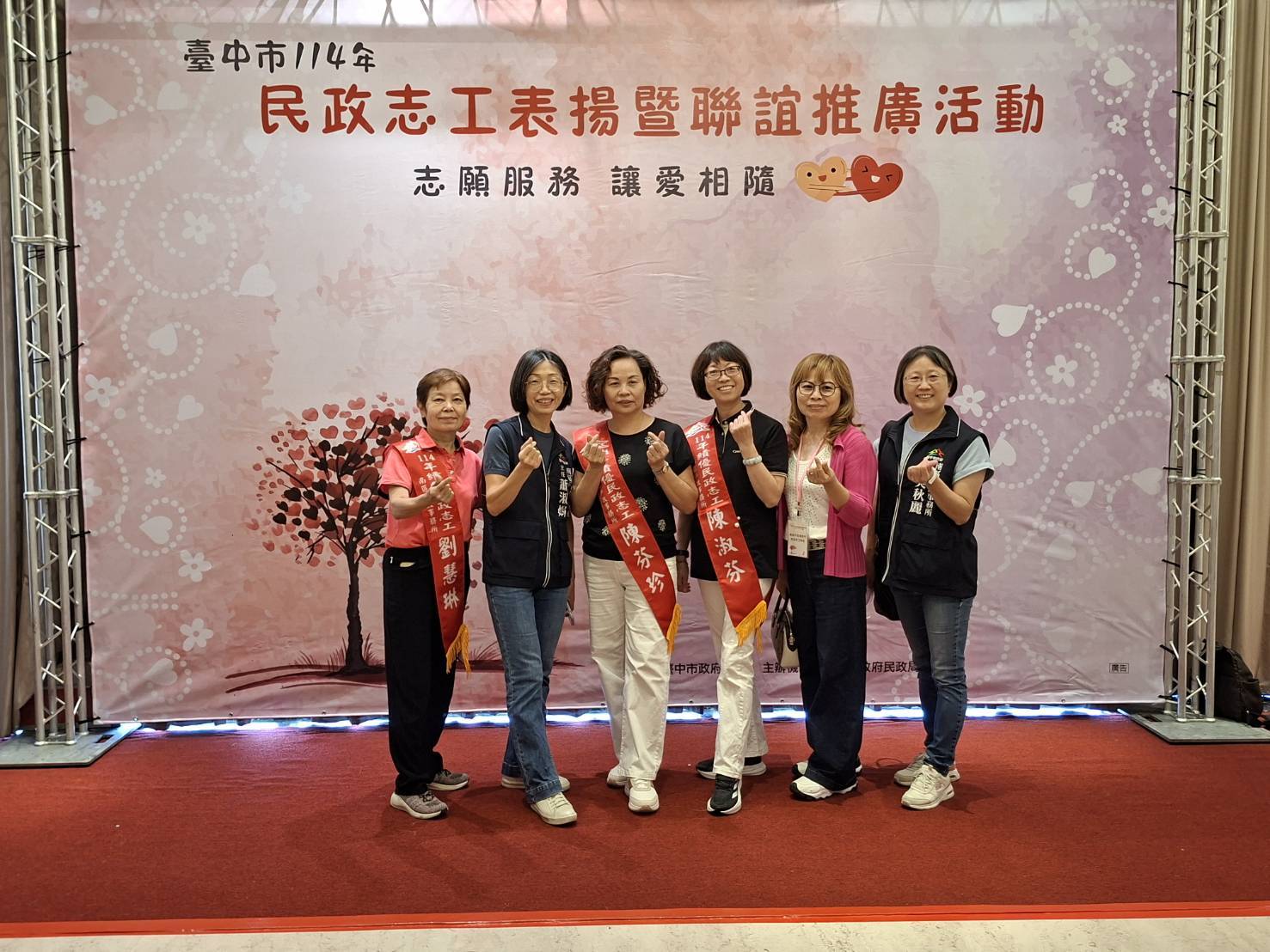114年民政志工表揚活動~志願服務 讓愛相隨 臺中市政府民政局於114年10月31日上午舉辦民政志工表揚活動,恭喜本所志工陳芬珍、劉慧琳及陳淑芬獲得績優民政志工的殊榮並接受局長吳世瑋表揚,肯定志工們的付出及貢獻。 本所主任蕭淑娟由衷感謝每位志工夥伴平日的辛勞,因為您們無私奉獻,讓南區戶政的服務更優質更貼心,謝謝您們。