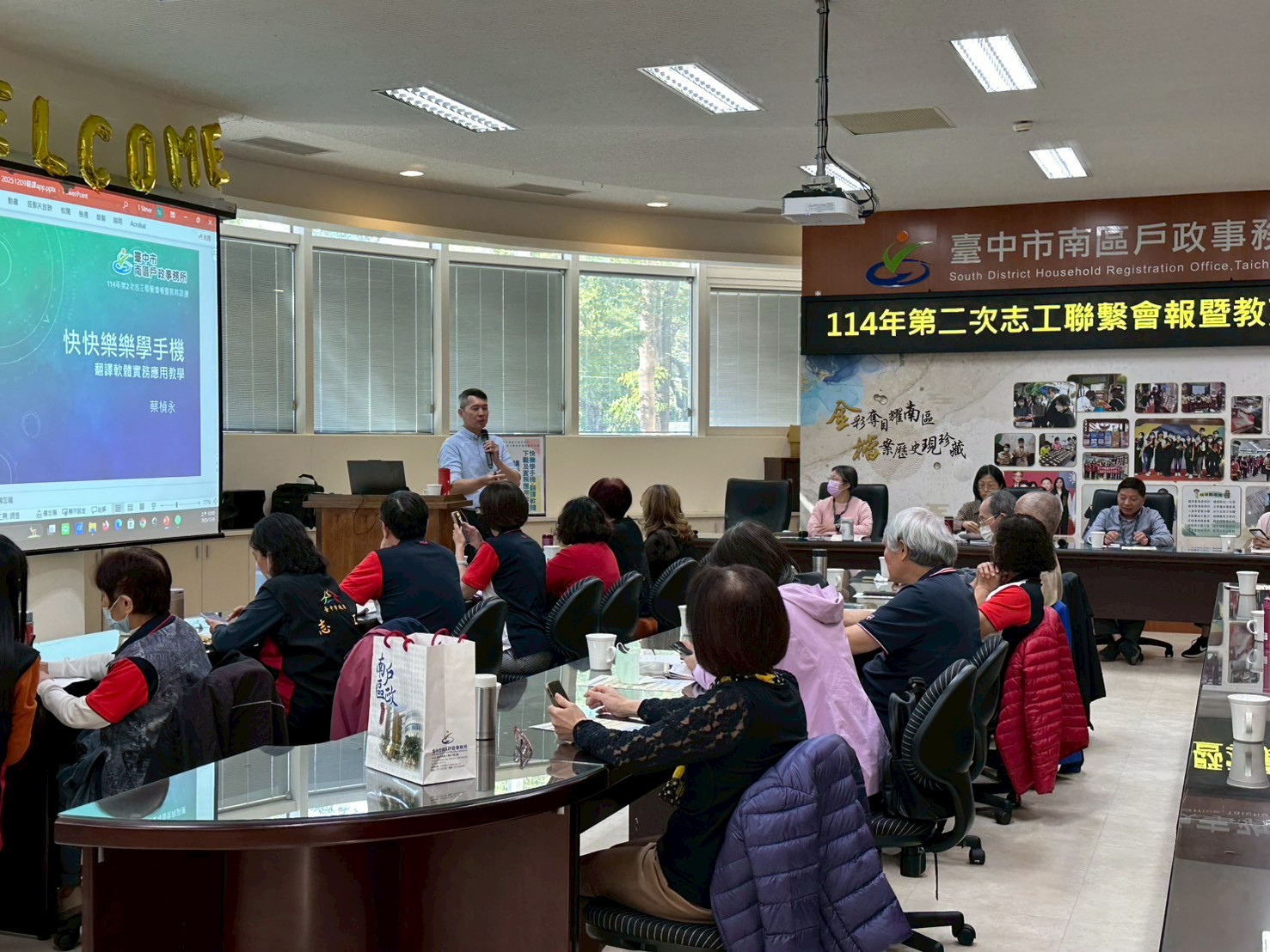 本次會議除了志工工作報告、服務禮儀介紹及戶政業務宣導等,教育訓練特別邀請蔡楨永老師講授「快樂學手機翻譯軟體下載及實務應用教學」,✨教導志工下載翻譯軟體及實際操作,志工們相互討論,互動熱絡,增進彼此間情誼!