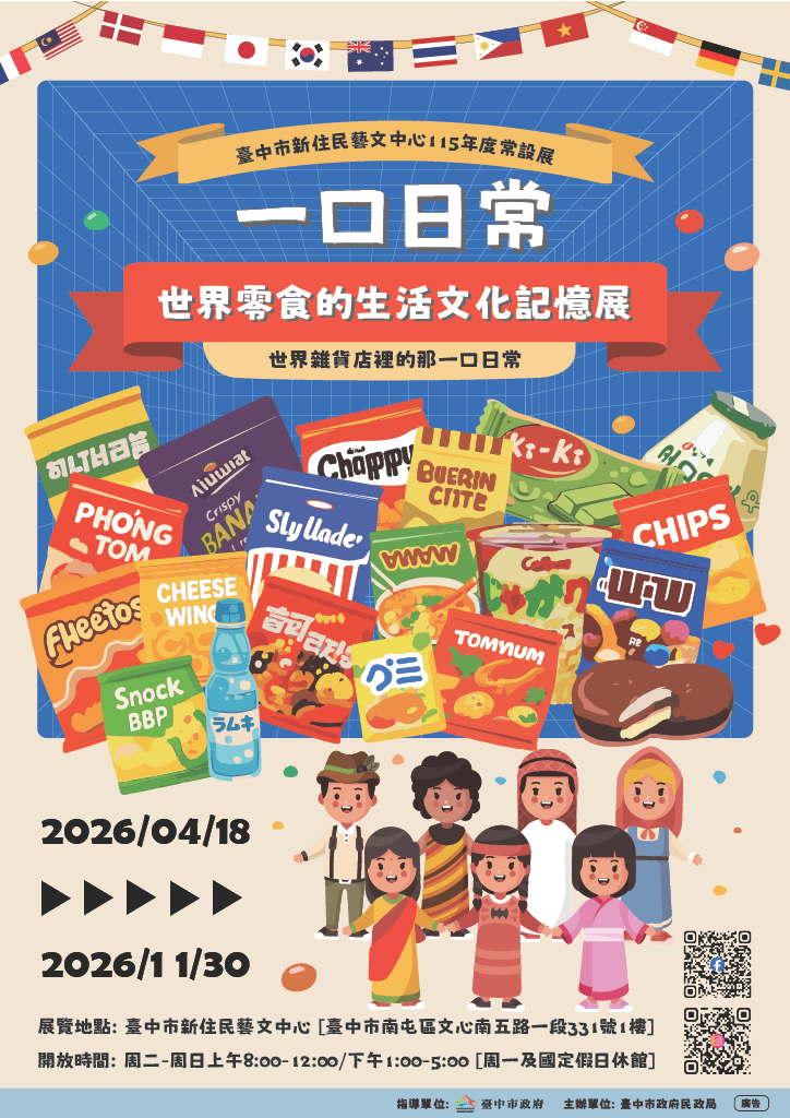 一口日常世界零食的生活文化記憶展 一、展覽日期及時間: 日期:115年4月18日至11月30日止。 時間:周二~周日上午8:00-12:00/下午1:00-5:00。 二、展覽地點: 臺中市新住民藝文中心 (臺中市南屯區文心南五路一段331號1樓)。